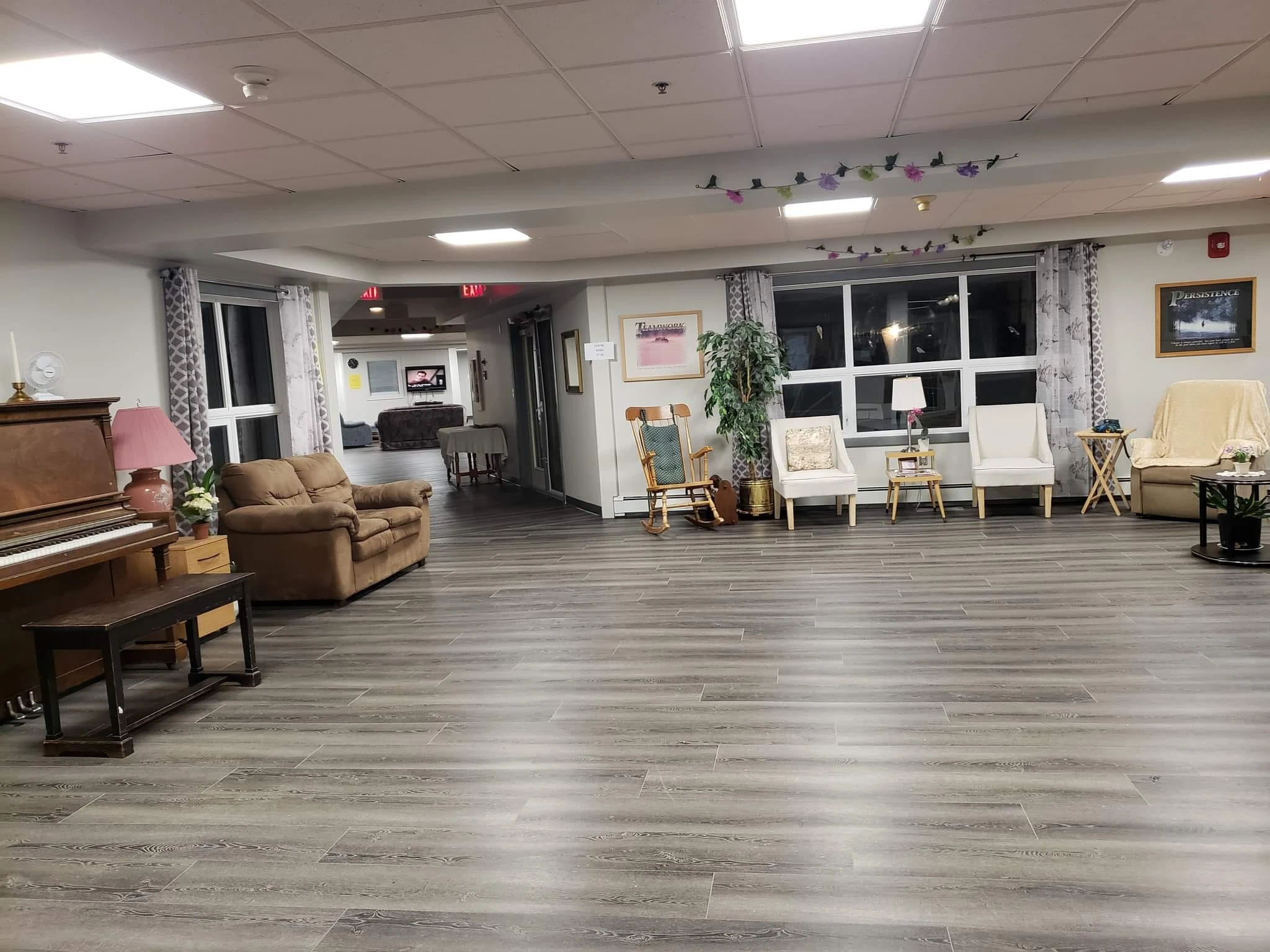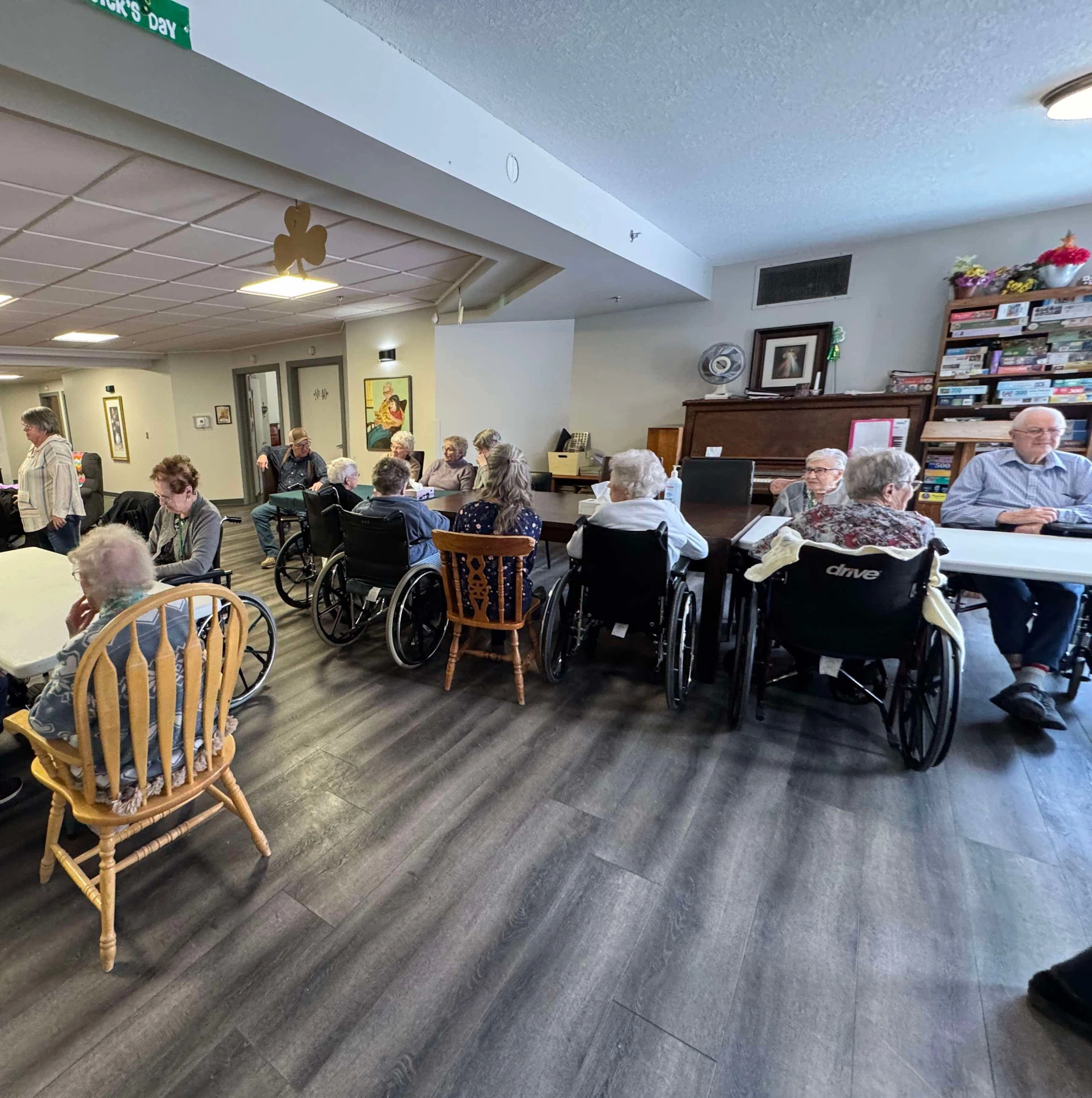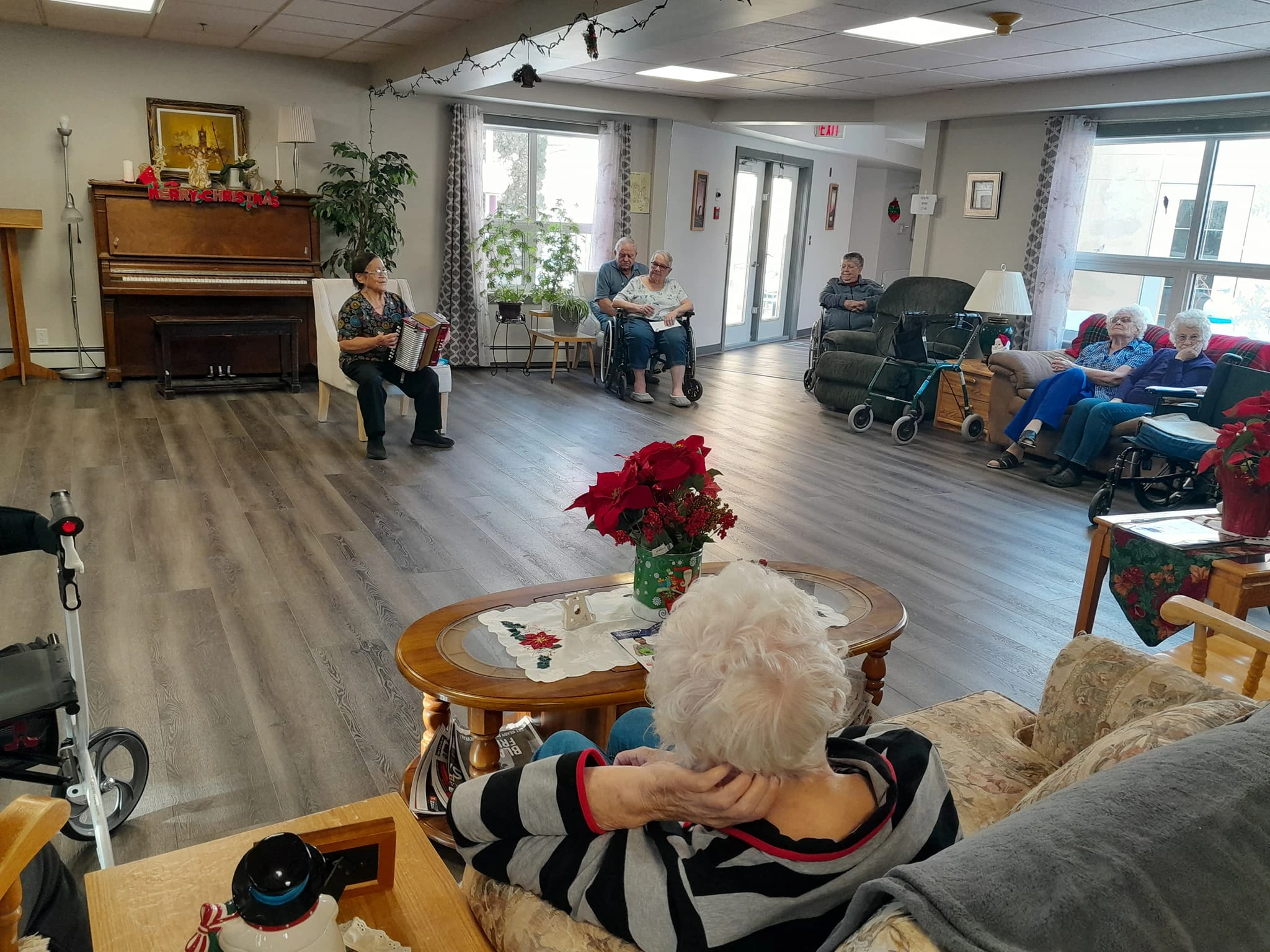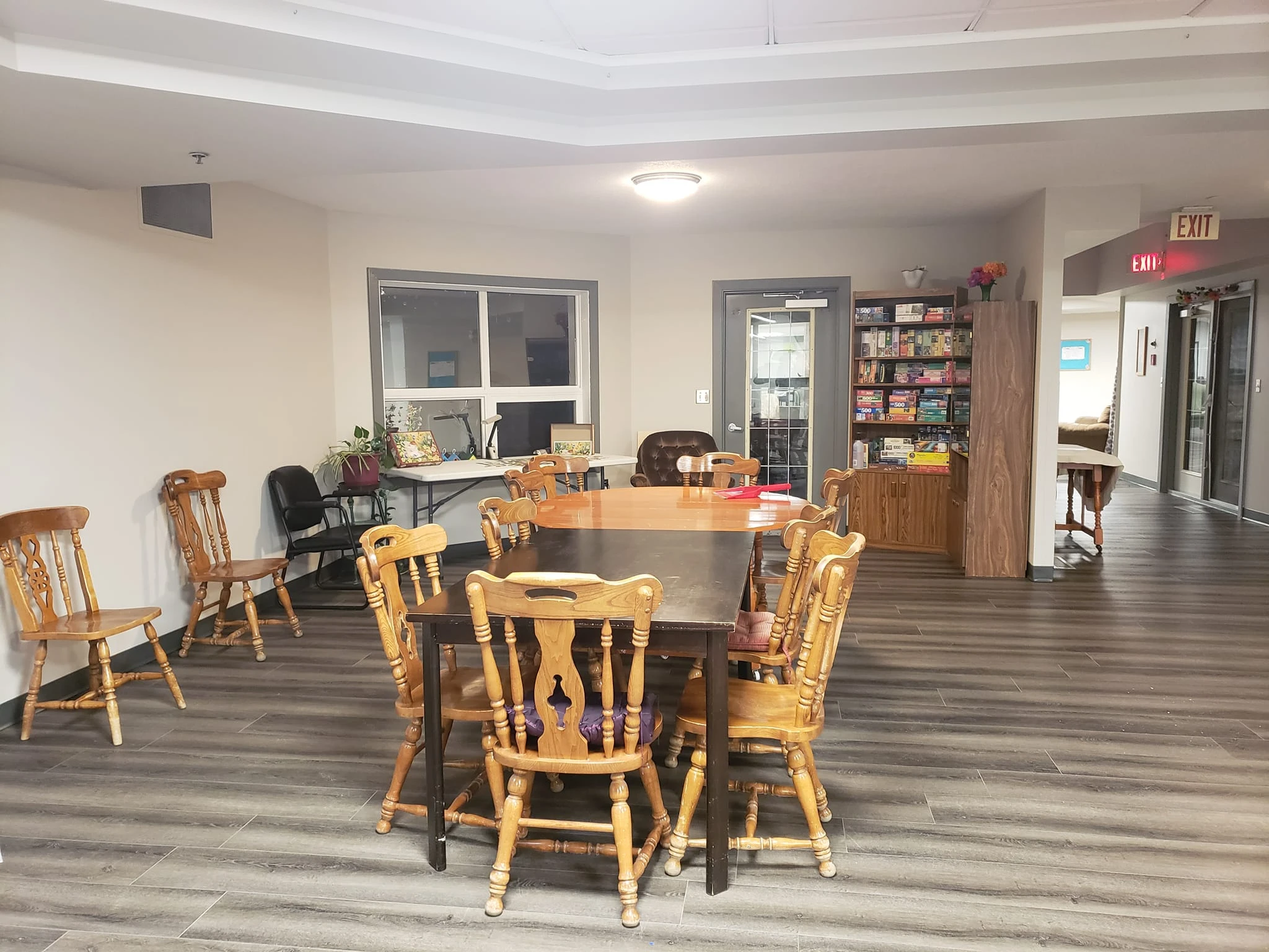 The facility currently features 43 rooms- double rooms suitable for couples, and single rooms for individuals. All rooms are wheelchair-accessible, and include living space, closet space, and a private washroom. Communal spaces include a living room, coffee area, dining room, laundry room, and main activities room. Each wing has its own tub room, with assistance available upon request.